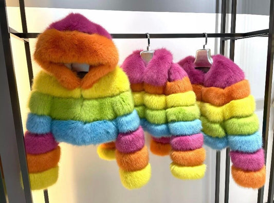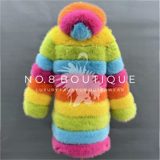 Premium Rainbow Hooded 9 Row Faux Fur Coat